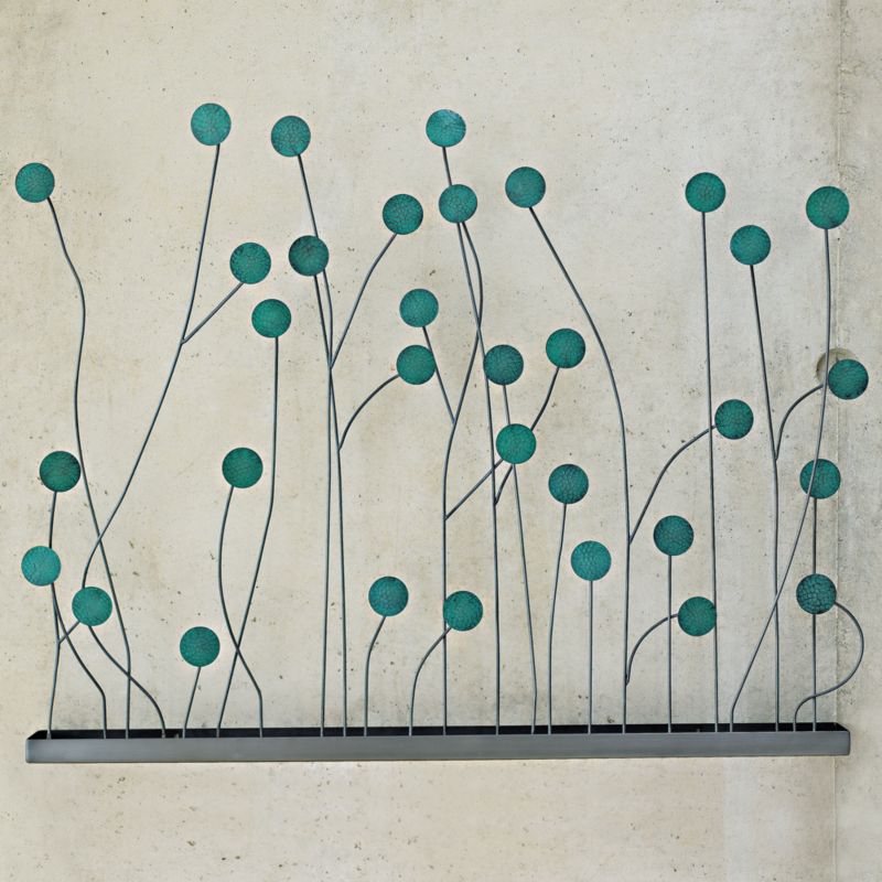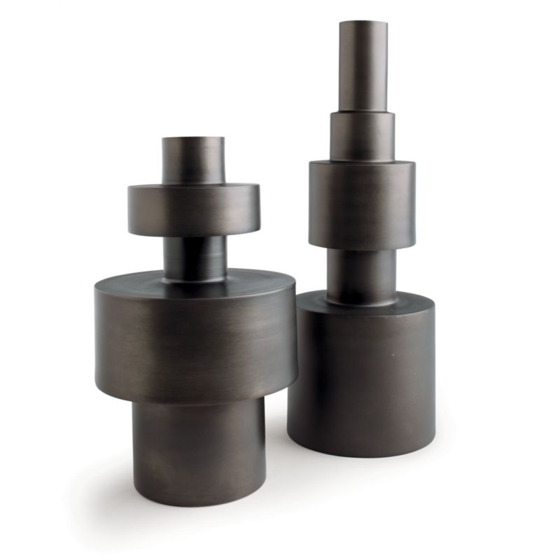 silver connected vase are all from CB2. These pieces are all different in their lines, which creates interest in each piece. Although the pieces vary in style and shapes they really reinforce the color pallet and bring the space together as a whole. I really like how the teal blue wall art piece makes some of the yellow aspects really pop. The vases from CB2 are really fun and different. The black vases bring a lot of different size variations in and of themselves. The yellow vase is fun, and brings in more straight lines that we have in our furniture. Lastly we have our connected silver vases. I love these types of vases, because it really makes each flower a focal point. This piece would be great on that mid century sofa table.